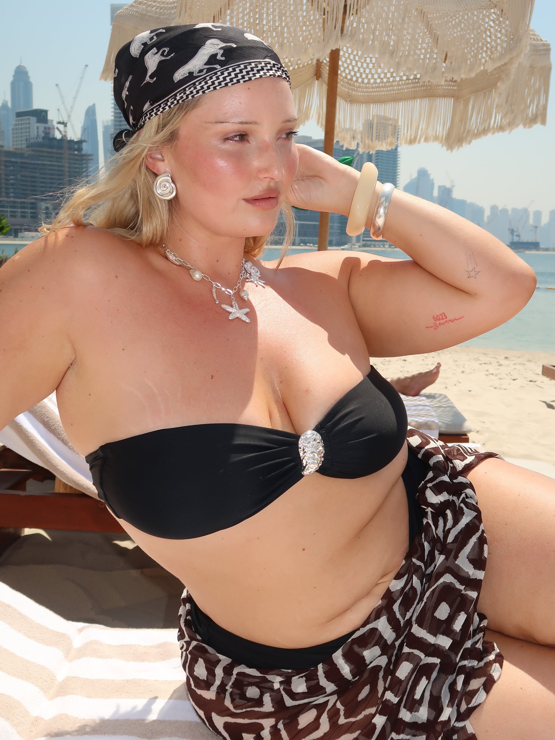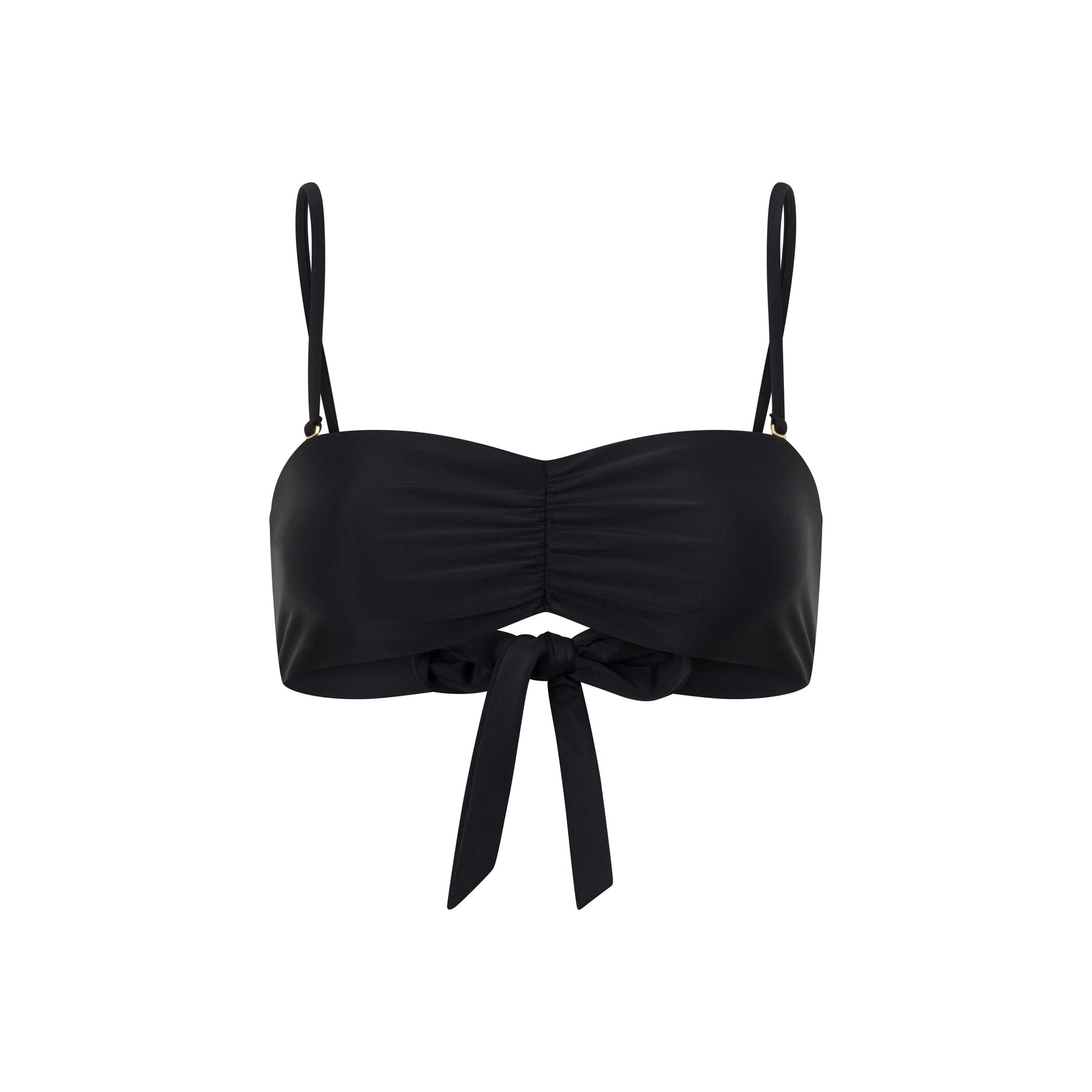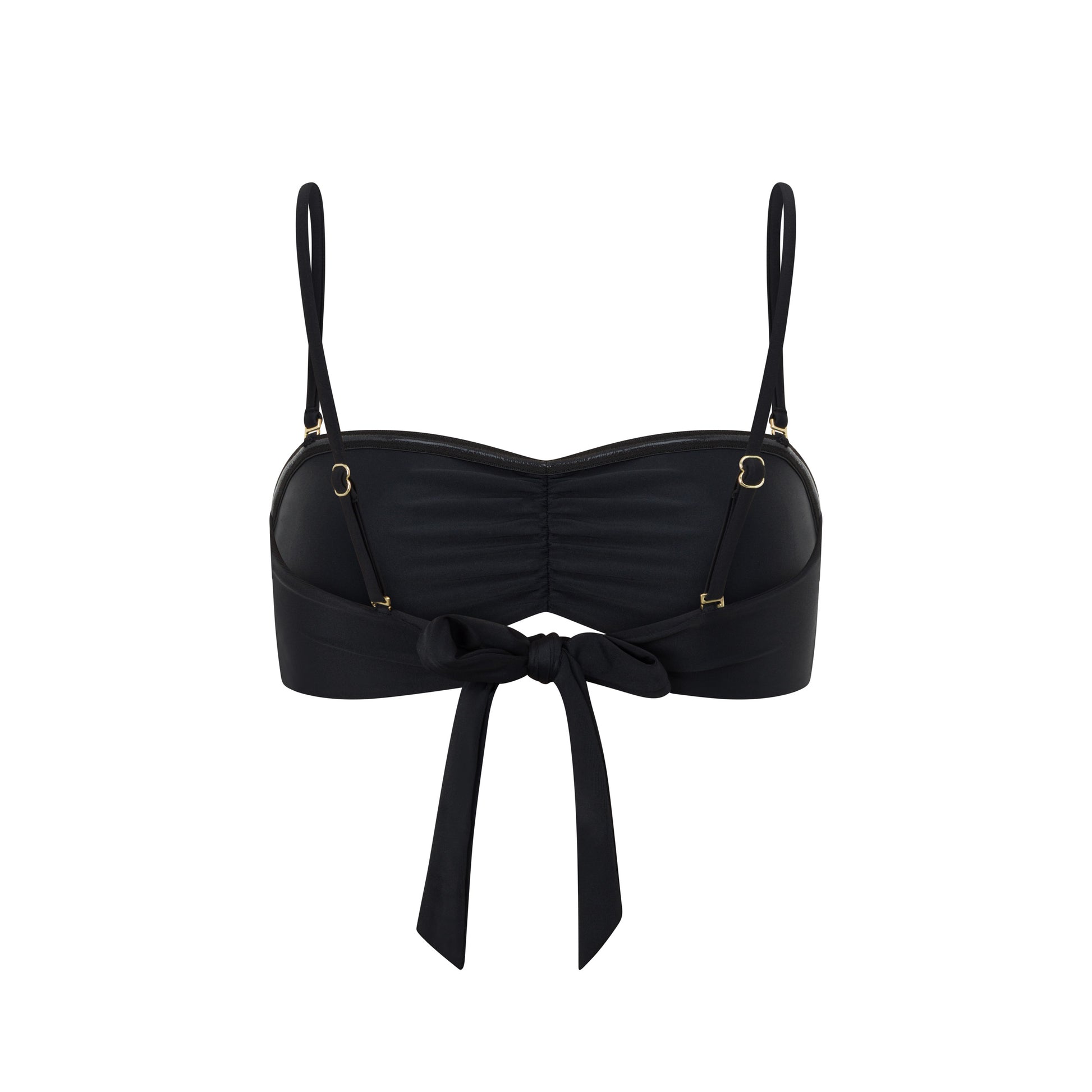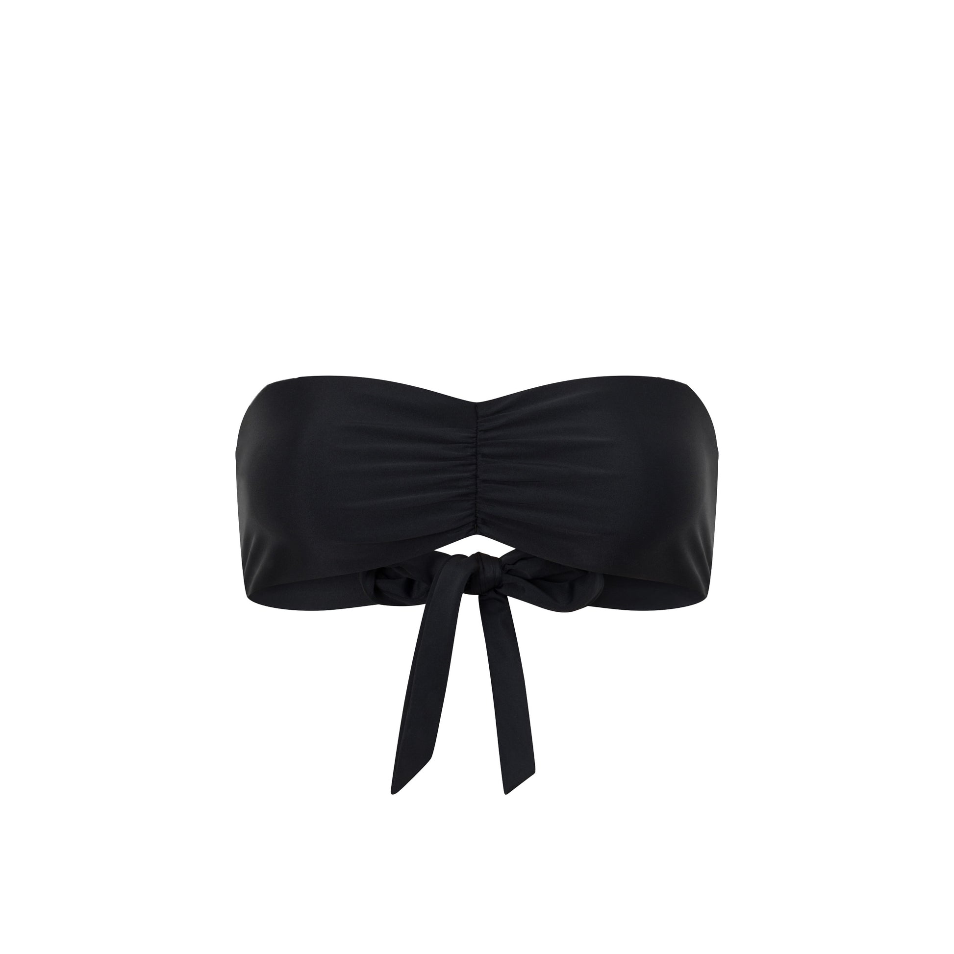 Chic and versatile, this gathered black bandeau features a tie-back closure, adjustable straps, and a double-lined, wire-free design. Wear it with or without a brooch for effortless style
